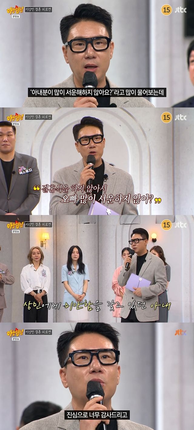 이상민은 "오히려 저에게 아내의 바람대로 결혼식이 없는 결혼식을 올린 것에 대해서 그것에 대한 미안함을 오히려 아내가 갖고 있었는데, 오늘 저는 축하를 받았어요. '아는 형님'에서"라고 전했다.