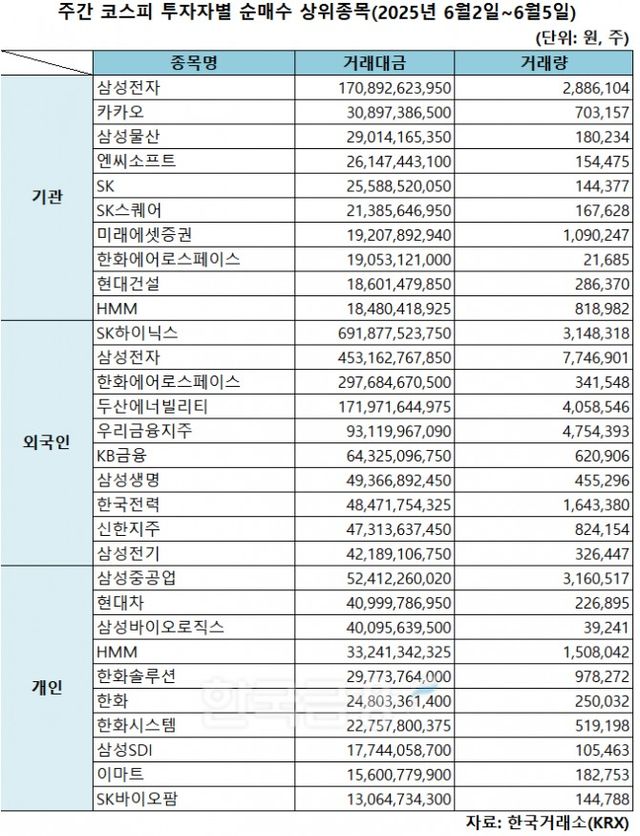 기관 '삼성전자'·외인 'SK하이닉스'·개인 '삼성중공업' 1위 [주간 코스피 순매수- 2025년 6월2일~6월5일]