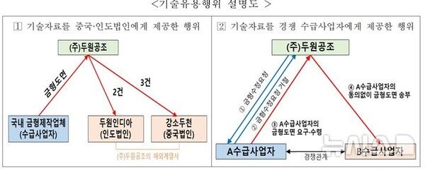 또 두원공조는 자신과 대금 정산 갈등을 빚고 있던 수급사업자의 금형도면 1건을 수급사업자의 동의 없이 경쟁 수급사업자에게 보내 금형을 수정하게 하는 방식으로 기술자료를 유용하기도 했다.