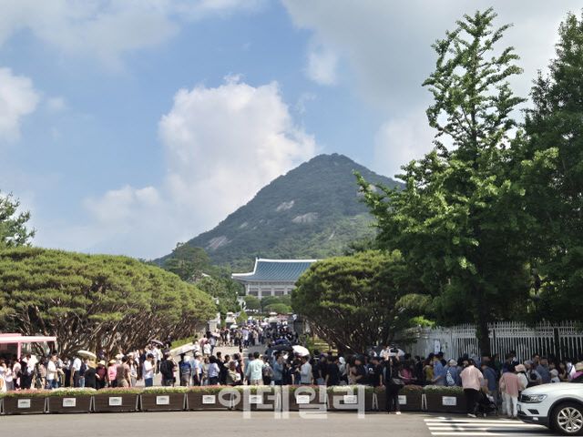 청와대재단은 하루 2만 2000명씩 4주치 예약을 6개 시간대로 나눠 받고 있다. 현장 신청은 65세 이상, 장애인, 국가보훈대상자, 외국인으로 제한해 매일 2000명을 받는다. 재단에 따르면 오는 4주 치 휴일 관람 예약은 이미 마감됐다. 휴관일인 화요일을 제외한 평일도 대부분 예약이 끝났다. 대선 기간이었던 지난달에는 관람객 42만여명이 청와대를 찾아 역대 최대치를 기록했다.