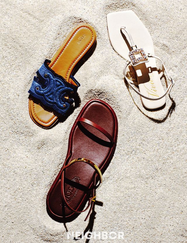 Tod’s 골드 메탈 바 장식으로 포인트를 준 브라운 카프스킨 샌들 1백1만원.