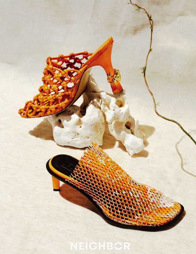 Bottega Veneta 개구리 모티프 골드 메탈 굽 장식이 특징인 그물 디자인의 뮬 펌프스 가격 미정.