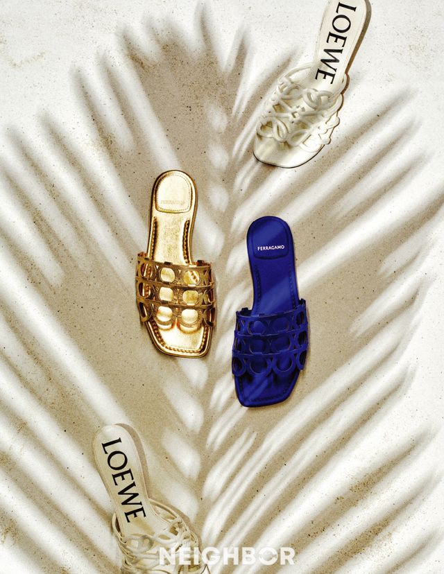Ferragamo 어퍼에 간치니 로고를 컷아웃한 골드와 블루 컬러 슬라이드 각각 1백39만원.