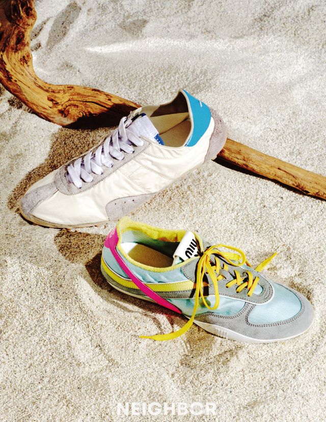 Miu Miu 멀티컬러 밴드와 기능성 소재로 스포티한 무드를 보여주는 김나지움 스니커즈 가격 미정.
