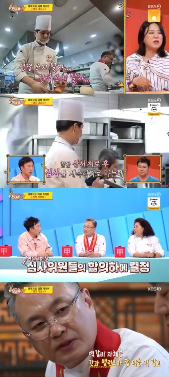 권정일은 "막내 때나 미숙할 때 칼에 베인 적이 있기는 하지만 평소에는 실수를 안 하는데 너무 대단한 분들 앞에서 하니까 당황한 게 있지 않았나"라고 전했다.