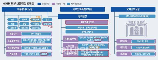 한편 이재명 정부의 대통령실은 장관급 4명(비서실장, 정책실장, 국가안보실장, 외교안보특별보좌관), 차관급 11명(수석비서관 7명, 재정기획보좌관, 제1·2·3차장) 비서관 50명의 조직으로 꾸려지게 됐다. 전임 정부와 비교했을 때 비서관급이 1명 더 추가됐다.
