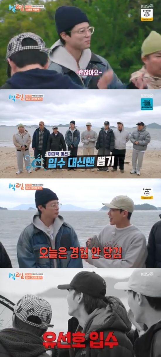 돌림판 결과 유선호가 입수 당첨자로 결정됐다. 박보검은 막내 유선호의 입수에 담요를 들고 걱정하면서 지켜봤다.