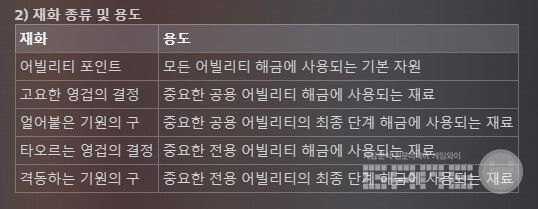 이걸 해금하려면 재화가 필요하다. 기본은 어빌리티 포인트로, 미션과 전투를 통해 꾸준히 모을 수 있다. 하지만 더 강력한 어빌리티를 뚫으려면 고요한 영겁의 결정이나 얼어붙은 기원의 구 같은 공용 어빌리티 재료, 그리고 타오르는 영겁의 결정이나 격동하는 기원의 구 같은 전용 어빌리티 재료가 필요하다. 이 재화들은 한정적이니, 초반엔 공용 어빌리티로 기본 스탯을 올리고, 주력 캐릭터가 정해지면 전용 어빌리티에 올인하는 전략이 효율적이다. 미션을 깨면서 재화를 모으는 걸 잊지 말자!