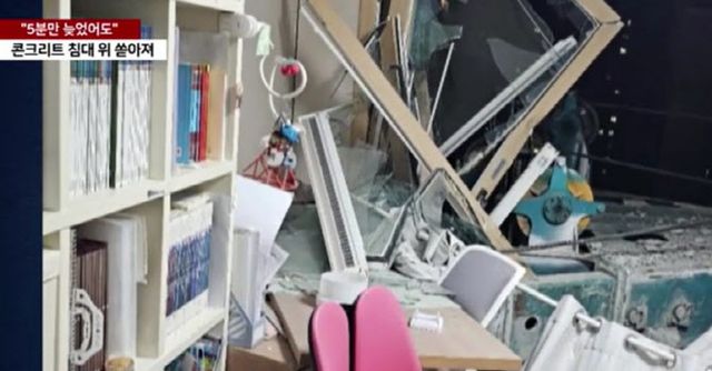 A씨가 공개한 사진엔 아이의 방 벽에 책장이 있었고, 그 옆으로 책상이 놓여 있었다. 그런데 천공기가 외벽에 부딪히며 유리창이 깨지고 부서진 벽체가 집 안으로 밀려 들어오면서 끊기고 휘어진 철근이 그대로 모습을 드러냈다. 또 콘크리트 덩어리가 쏟아지며 침대의 형태는 거의 보이지 않을 정도로 피해를 입었다.