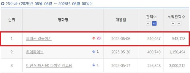 ‘드래곤 길들이기’는 개봉 직후 ‘미션 임파서블: 파이널 레코닝’, ‘미키 17’에 이어 올해 세 번째로 높은 오프닝 스코어를 기록하며 흥행을 예고했다. 또한, 개봉 전부터 현재(9일)까지 7일 연속 전체 예매율 1위를 기록하며 관객들의 폭발적인 관심을 독차지하고 있다. 9일 오전(8시 30분 기준) 예매율은 23.1%를 기록 중이다.
