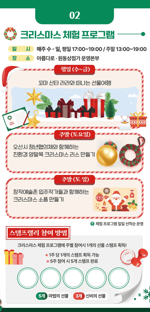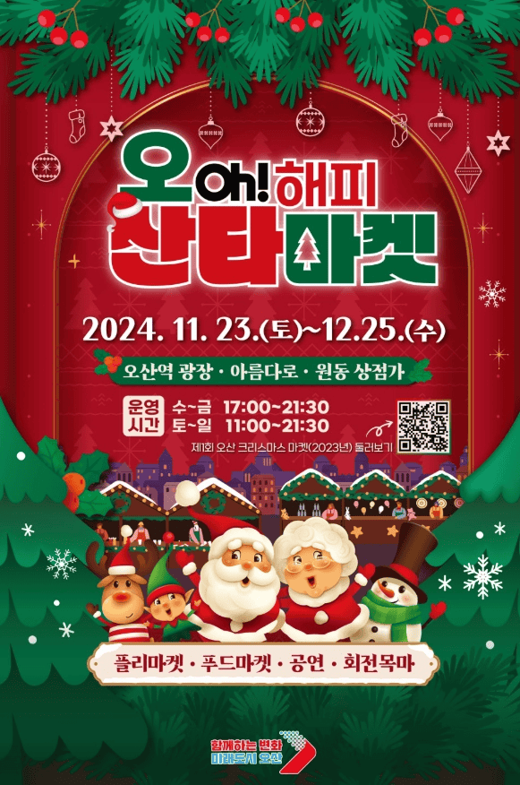크리스마스 분위기로 가득한 오산 마켓에서는 산타와의 특별한 만남, 핸드메이드 공예품 구매, 마술쇼 등의 이벤트가 당신을 기다리고 있습니다. 따뜻한 핫초코와 군밤으로 추위를 녹이며 사랑하는 사람들과 행복한 시간을 보내세요.