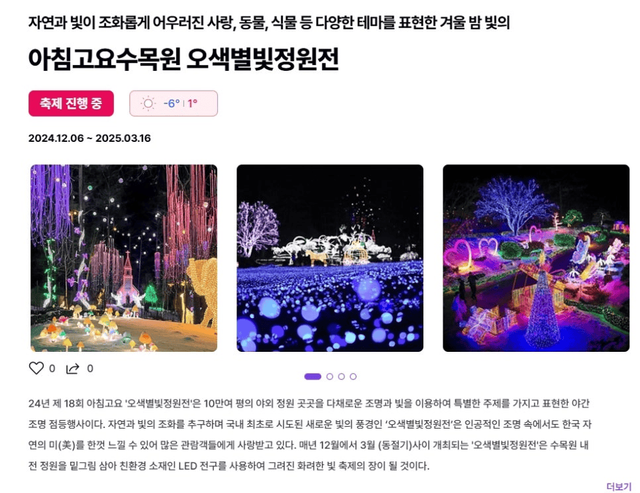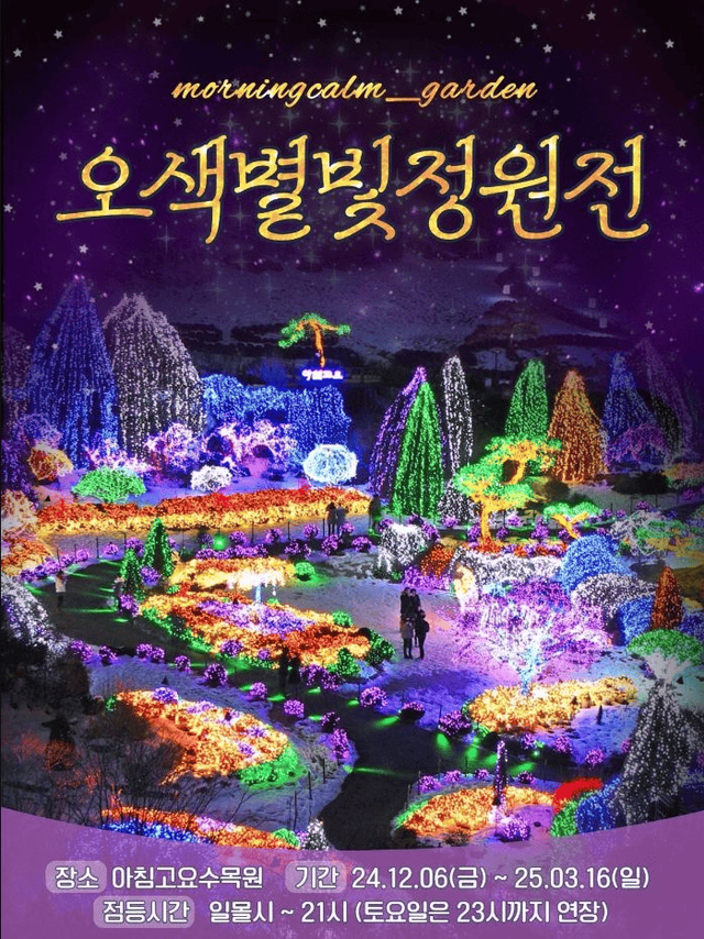 아침고요수목원에서는 환상적인 LED 조명이 오색 별빛 정원을 만들어냅니다. 이곳은 연인과의 낭만적인 밤 산책은 물론, 가족들과의 특별한 시간을 위한 최고의 장소입니다. 별빛과 조명이 어우러지는 밤 정원에서 따뜻한 차와 함께 겨울의 아름다움을 만끽해보세요.