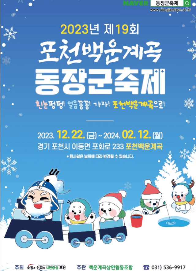 포천 백운계곡에서 펼쳐지는 이 축제는 겨울 동화 속 설경을 실현시킵니다. 얼음 낚시, 눈썰매, 아이들을 위한 전통 놀이 체험이 한가득 준비되어 있어 소중한 추억을 만들어줄 것입니다. 또한, 포천 특산물 요리도 맛볼 수 있어 겨울의 정취를 한층 더합니다.