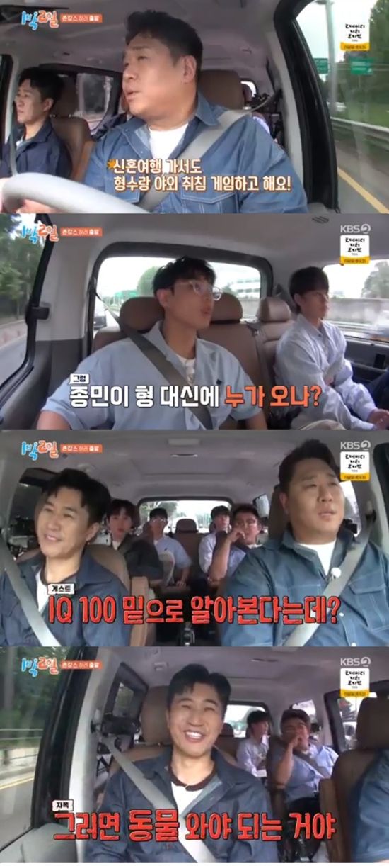 김종민은 문세윤이 "아이큐 100 밑으로 알아보고 있다는데"라고 하자 "그럼 동물이 와야 하는 거 아니냐"고 자폭해 웃음을 자아냈다.