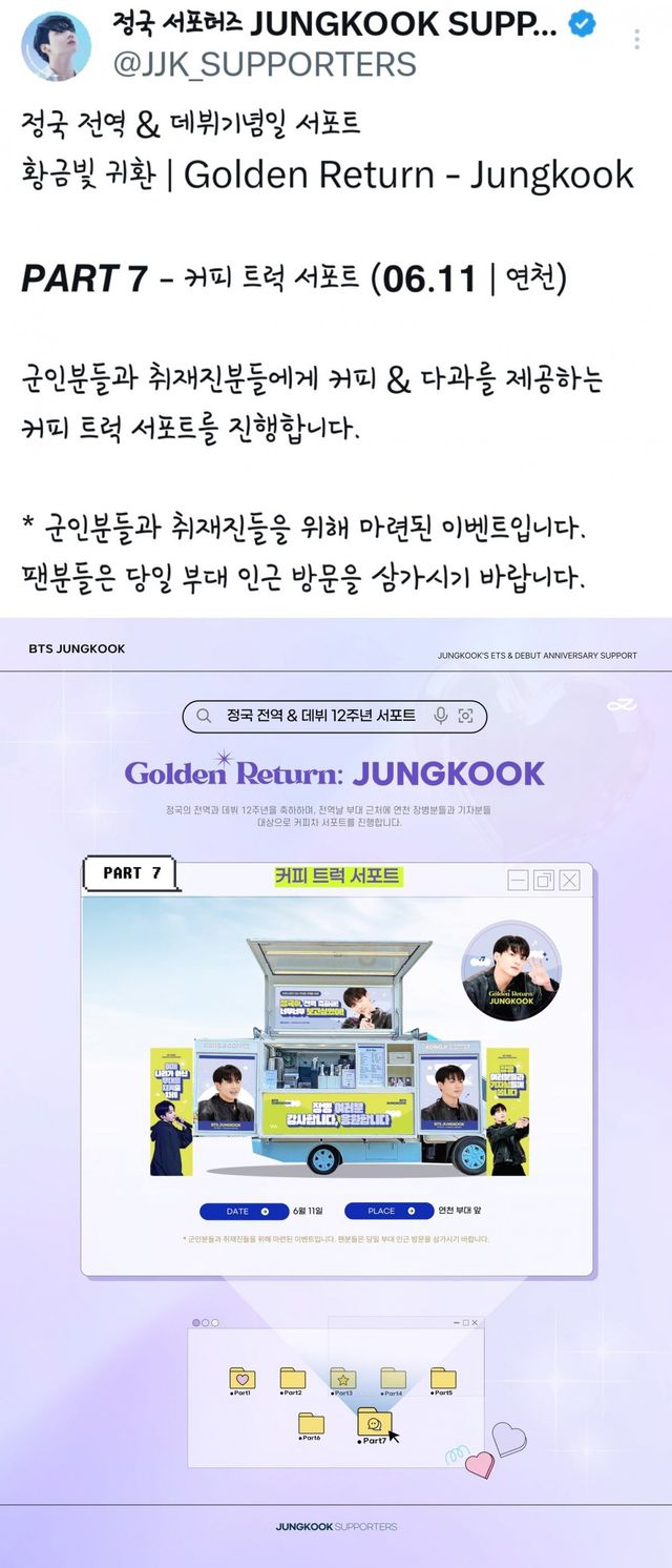 ‘정국 서포터즈’는 이미 6월 5일부터 8일까지 커피베이 연천전곡점과 베스킨라빈스 경기연천점에서 군복 착용 군인들에게 무료 음료와 아이스크림을 제공하는 ‘정국이가 쏜다’ 이벤트를 진행했다. 단순한 팬 이벤트를 넘어 군 장병까지 챙기는 배려심으로 눈길을 끌었다.