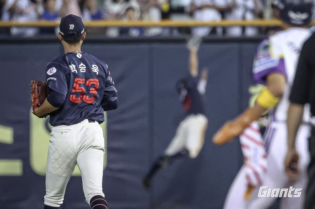 이때 우익수였던 김동혁이 몸을 날려 포구에 성공했다. 시선은 공에 둔 채 몸을 진행 방향으로 날렸다. 마치 뒤로 뛰는 것 같은 모습으로 공을 잡아냈다. 1루 주자였던 김민석은 황급히 1루로 귀루 해야 했다. 안타를 확신할 수밖에 없는 타구였기에 리터치는 선택지로 두지 않았던 모양새다. 김원중은 이후 대타 류현준을 3루 땅볼, 후속 이유찬을 투수 앞 땅볼로 돌려세우며 이닝을 마무리했다.