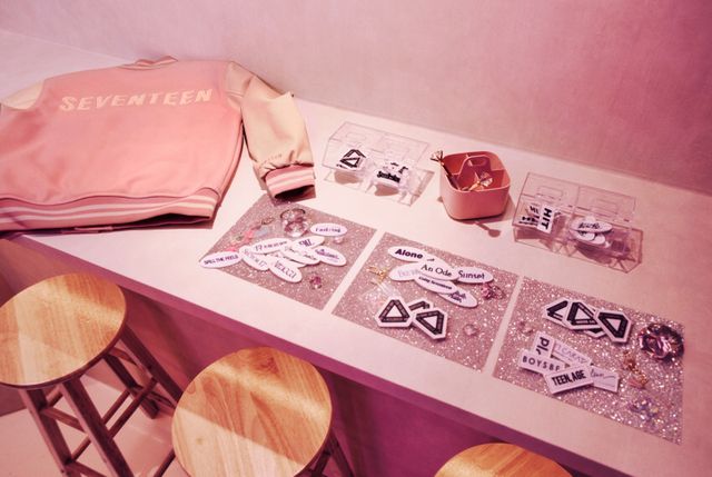 이어 도착한 곳은 세븐틴 룸이다. 곧바로 세븐틴이 직접 입었던 촬영 의상이 보이는데, 중앙에서 사진 찍는 것이 포인트다. 또 이곳에서는 스태프들이 로즈쿼츠 색상의 커스텀 레터링 재킷을 팬들에게 선물했다. 이를 직접 스탬프와 소품 등으로 커스터마이징하는 공간도 마련됐다.