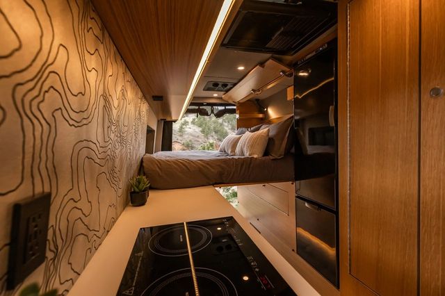 취침 공간은 머피 베드 방식으로, 주방 반대편 벽면에서 침대를 내려 펼치면 2인용 침대로 바뀐다. 여기에 독서등과 USB 충전 포트, 천장형 에어컨도 탑재됐다. 전기 시스템은 1,000Ah 용량의 리튬이온배터리와 태양광 패널, 외부 전원 및 차량 주행 충전 기능까지 갖춰 장기간 외부 생활도 무리가 없을 것으로 보인다.