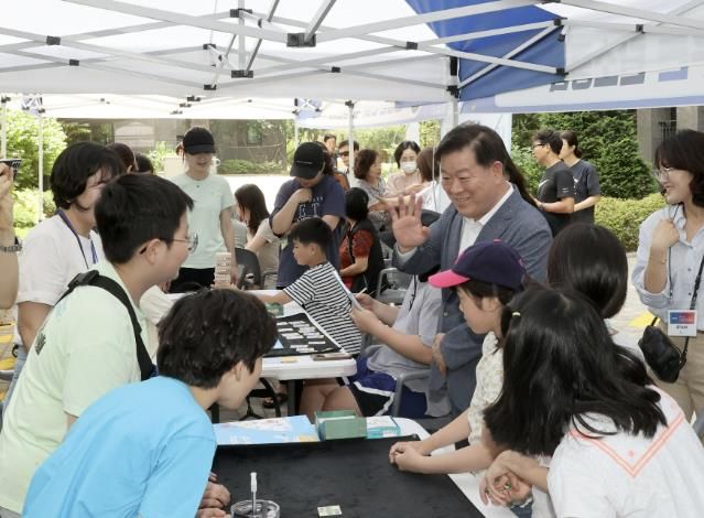 | ▲ 박승원 광명시장이 8일 광명아크포레자이위브아파트에서 열린 '아.소.하(아주 소중한 만남의 하루)'에 참석해 체험부스에서 어린이들과 인사를 나누고 있다. |