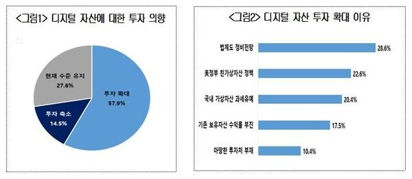 응답자들이 디지털 자산 투자를 확대하려는 이유는 '법제도 정비 전망'이 28.6%로 가장 높게 나타났다. 이어 '미국 정부의 친가상자산 정책'(22.6%), '국내 가상자산 과세 유예'(20.4%), '기존 보유자산 수익률 부진'(17.5%), '마땅한 투자처의 부재'(10.4%) 등의 순이었다.