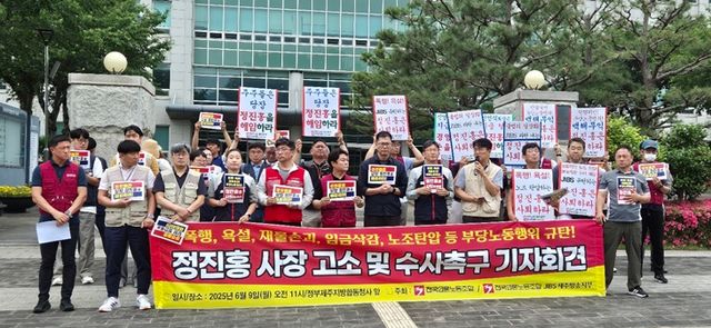 노조는 이날 오전 제주시 도남동 정부제주지방합동청사 고용노동부 제주근로센터 앞에서 기자회견을 열어 "사측은 노조에 대한 폭행과 욕설, 재물손괴, 단체교섭 거부, 노조 탄압 등 부당노동행위를 벌이고 있다"고 주장하면서 이같이 밝혔다.