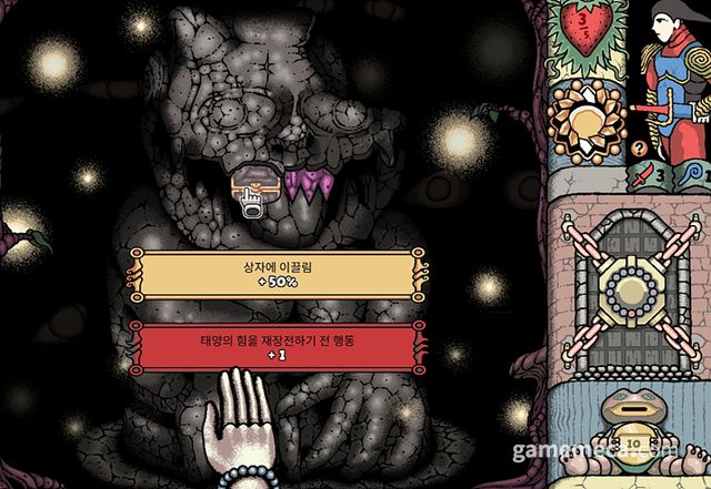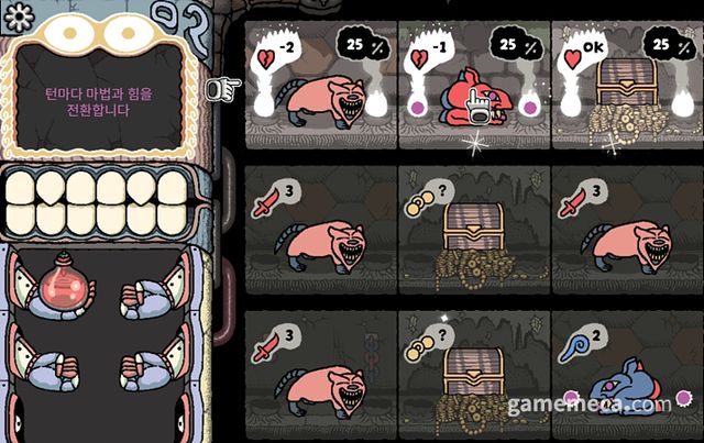 돈을 모아 돌 조각상을 해금하면 솔 세스토의 본격적인 확률 놀음이 시작됩니다. 돌 조각상에서는 이빨 모양의 유물을 얻을 수 있는데, 이들은 특정 방에 갈 확률을 바꿉니다. 예를 들어 상자로 향할 확률을 50% 증가시키는 대신, 체력을 깎거나 함정에 도달할 확률을 높이는 식입니다. 돌 조각상 확률 유물은 무조건 메리트와 디메리트가 공존합니다. 물론 이렇게 확률을 열심히 조정해도, 운이 나쁘다면 10% 확률로 강적에 돌진하거나 연속으로 함정에 걸릴 수도 있습니다.