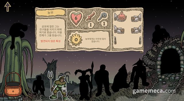던전에 진입하기 전, 먼저 모험가를 선택할 수 있습니다. 튜토리얼에서는 아무런 능력도 장점도 없는 '농부'만 선택할 수 있으며, 튜토리얼이 끝나면 '기사'가 해금됩니다. 이후 기사로 플레이하면서 던전에서 얻는 금화를 소모해 새로운 모험가를 개방할 수 있습니다. 이외에도 체력이 높지만 마법 수치가 0인 기사, 마법에 특화된 마법사 등도 등장합니다.