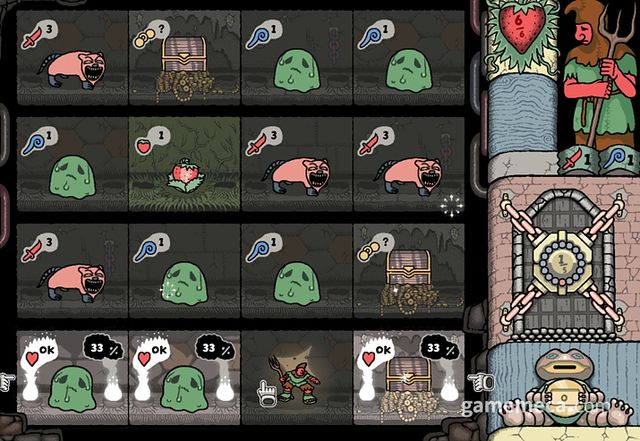각 방에는 몬스터, 보물 상자, 함정, 체력 회복 중 하나가 놓여있습니다. 몬스터 방으로 진입할 경우 해당 몬스터와 짧은 전투를 합니다. 몬스터마다 서로 다른 힘과 마법 수치를 보유했는데, 모험가의 능력치보다 높다면 해당 수치만큼 피해를 입힙니다. 일부 몬스터는 특수 능력을 보유했습니다. 몬스터 방에 기묘한 구체가 보인다면 해당 몬스터는 능력을 보유한 것이며, 게임 화면 왼쪽 위 거울에서 어떤 능력인지 확인하고 전략을 세울 수 있습니다.