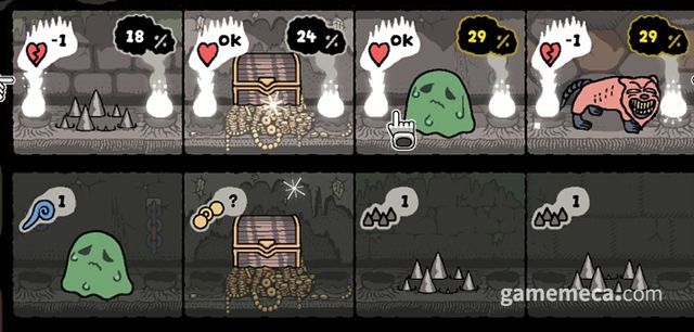 방을 이동하거나 아이템을 사용하면 한 턴이 지나가며, 한 맵에서 일정 턴을 생존하면 다음 층으로 내려갈 수 있습니다. 던전을 내려가다 보면 간혹 상점이나 조각상 등 이벤트가 등장하기도 합니다. 던전에서는 보물 상자를 열어 금화를 획득할 수 있는데, 이 금화는 상점에서 사용하거나 우물에서 지상으로 전송해 상점, 조각상, 캐릭터 해금 등에 사용합니다.