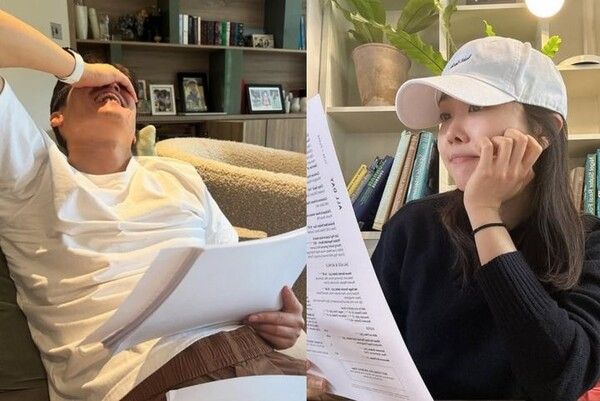 김민지의 책 원고를 읽던 중 웃음을 참지 못한 듯 얼굴을 가린 채 소파에 기대어 있는 모습이다.