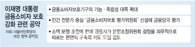 이런 방안은 이 대통령이 당선 전 공개적으로 밝힌 금융위 조직 개편과도 맞물려 있다. 이 대통령은 금융 소비자 보호 강화를 위해 금융소비자보호기구의 기능과 독립성을 대폭 강화하겠다는 내용을 공약집에 담았다. 실제로 금감원에서 금융소비자보호 기능이 떨어져 나가면 이 조직을 중심으로 제도 도입 논의가 이뤄질 것으로 보인다.