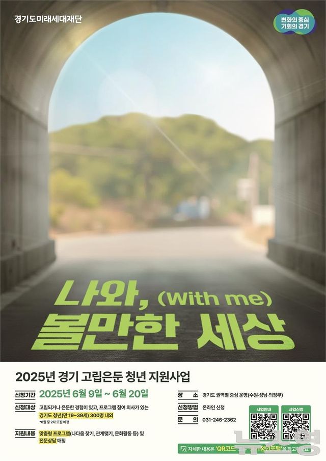 지원 대상은 경기도에 거주하는 19~39세 고립·은둔 청년이다. 참여를 희망하는 청년은 6월 9일부터 20일까지 경기청년포털또는 홍보 포스터 내 QR코드를 통해 신청하면 된다.