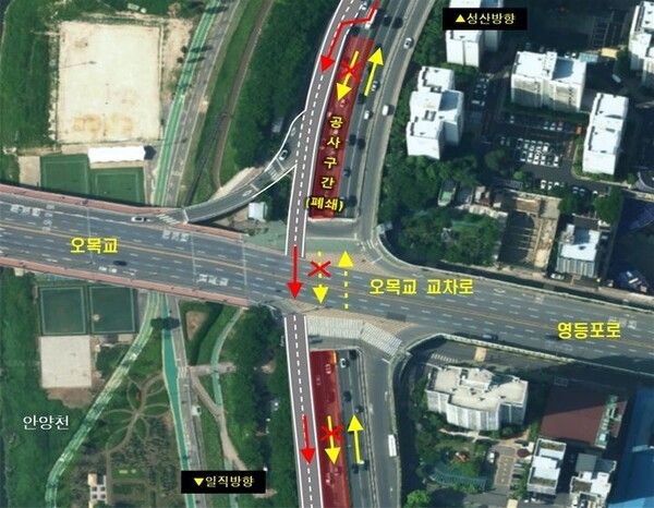 시는 오목교(동측) 지하차도 성산대교→일직방향 2개 차로가 폐쇄됨에 따라 차량은 기존 지하차도 대신 상부도로 2개 차로를 이용해 새로 설치된 오목교 평면교차로를 통해 주행하면 된다. 오목교교차로에는 가로형 3색 신호등 4개소가 신규 설치된다.
