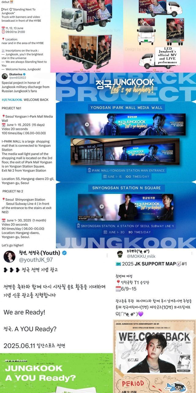 ‘정국 유튜브 스트리밍 팀’은 6월 11일부터 17일까지 용산 아이파크몰 싱크월 전광판에서 전역 축하 영상을 송출한다. ‘정국 채널 CIS’는 하이브 근처를 도는 영상 송출 트럭을 11일, 12일, 13일 3일간 운영한다.