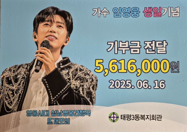 임영웅 팬클럽 ‘영웅시대 성남영웅건행국 뜨개모임’은 임영웅의 서른네 번째 생일을 기념해 경기도 성남시 태평3동 복지관에 561만6000원을 기부했다. 이 기부금은 관내 결손 가정과 독거 어르신들을 위한 복지 지원에 쓰일 예정이다.