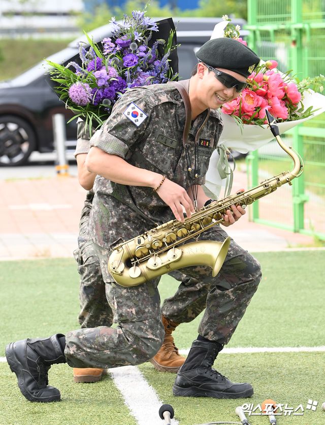 이날 군복 차림으로 색소폰을 든 채 등장한 RM은 화려한 연주로 현장의 시선을 사로잡았다. 전역의 기쁨을 온몸으로 표현하며 팬들과 뜻깊은 순간을 나눴다.