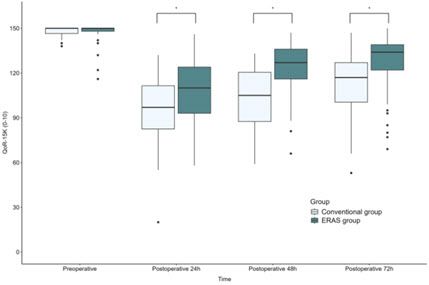 주요 평가 지표는 수술 후 24시간, 48시간, 72시간 동안 측정한 QoR-15K 점수(한국어판 회복의 질 평가 설문지, 총점 0~150점)였다. QoR-15K는 신체적 안위, 감정 상태, 신체 독립성, 심리적 지지, 통증 관리 등 5개 영역에 걸쳐 수술 후 회복 상태를 평가하는 15문항으로 구성돼 있다. 연구진은 기존 문헌에 따라 점수 차이가 8점 이상일 경우 임상적으로 의미 있는 개선으로 판단했다. 그 결과 ERAS군은 기존 치료군보다 평균 16점 더 높은 QoR-15K 점수를 기록했고(95% 신뢰구간: 8.9~ 23.0,P<0.001), 수술 후 회복의 질이 통계적·임상적으로 모두 유의하게 향상된 것으로 나타났다.