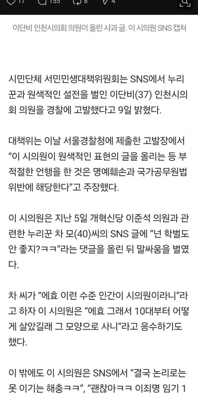 SNS에서 잼카 악플 달던 인천시의원 결국 고발당함ㅋㅋ