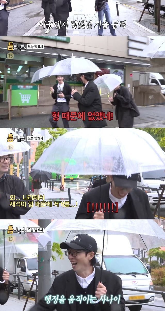 공개된 영상에서 유재석, 홍진경, 유연석, 이동휘는 비가 내리는 날 각자 우산을 쓴 채 도보로 이동했다.