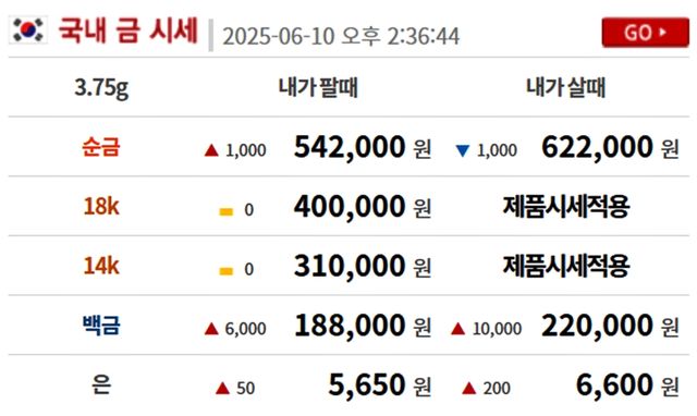 순금(24K) : 매입가 62만 2000원 / 매도가 54만 2000원