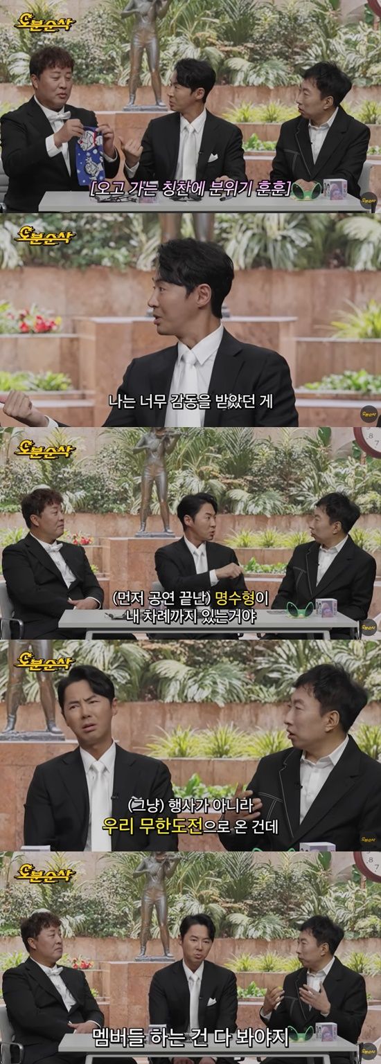 이에 박명수는 "이게 그냥 행사가 아니라 우리 '무한도전'으로 온 건데, 멤버들 하는 건 다 봐야지"라고 말해 훈훈함을 더했다.