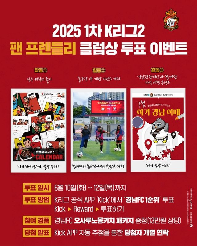 팬 투표는 6월 10일(화) 오전 8시부터 6월 12일(목) 자정까지 K리그 공식 어플리케이션 ‘Kick’을 통해 진행되며 경남은 투표를 해준 팬들을 추첨해 경남FC의 산리오 캐릭터인 ‘오사루노몽키치’ 굿즈 패키지를 증정할 예정이다.