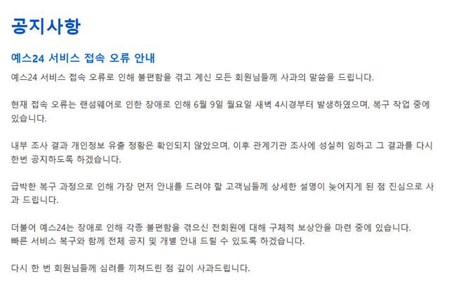 이번 접속 오류는 랜섬웨어로 인한 장애로 9일 새벽 4시경 발생했으며, 예스24는 사고 발생 직후 보안 강화 조치 및 한국인터넷진흥원(KISA) 등 관계 당국 신고와 함께 사고 원인 분석 및 피해 여부 파악에 최선을 다하고 있습니다.