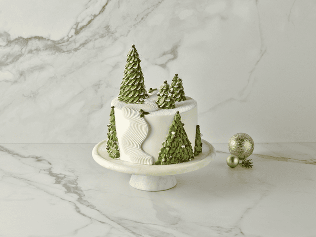 ‘파인트리 케이크(Pine Tree Cake)’는 겨울의 숲을 연상시키는 아름다운 디자인을 자랑하며, 눈꽃과 소나무 장식이 돋보입니다. 마스카르포네 크림과 라즈베리 콩피를 사용한 스펀지 케이크로 상큼하면서도 부드러운 맛이 특징입니다. 가격은 9만8000원입니다.