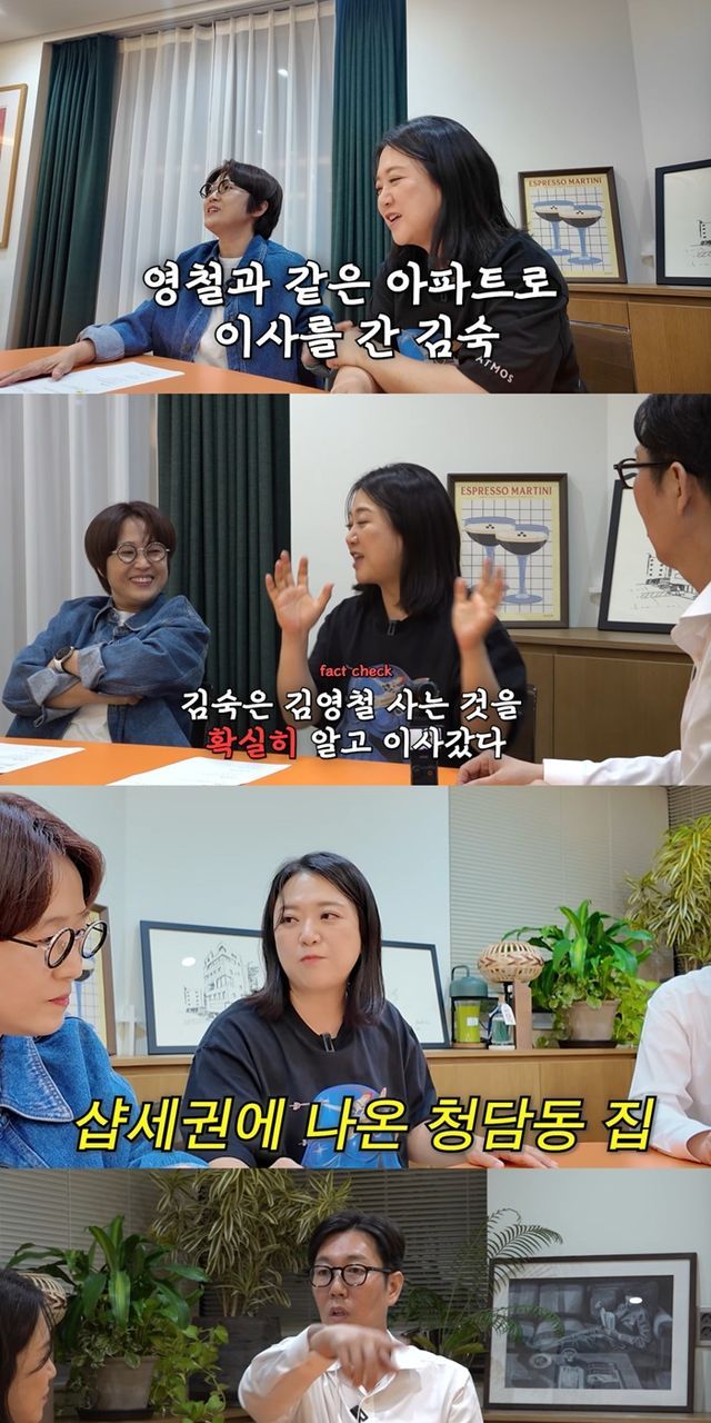 김숙은 "그때 마포에 살았는데 강남 샵까지 35분이 걸린다. 근데 걸어서 3분 거리에 집이 나왔다더라. 봤더니 김영철 동이었다"며 이사 이유를 밝혔다.