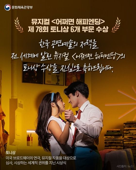 문화체육관광부는 유인촌 장관이제78회 토니상 시상식에서 뮤지컬 '어쩌면 해피엔딩'(Maybe Happy Ending)으로 극본상(Best Book of Musical)과 작사·작곡상(Best Original Score)을 받은 박천휴 작가에게 축전을 보내 축하와 격려의 뜻을 전했다고 10일 밝혔다.