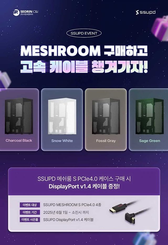 컴퓨터 주요 부품 유통 전문 기업 서린씨앤아이가 SSUPD의 인기 ITX PC 케이스 메쉬룸 S(MESHROOM S) 구매자에게 DP 1.4 케이블을 증정하는 이벤트를 진행한다.