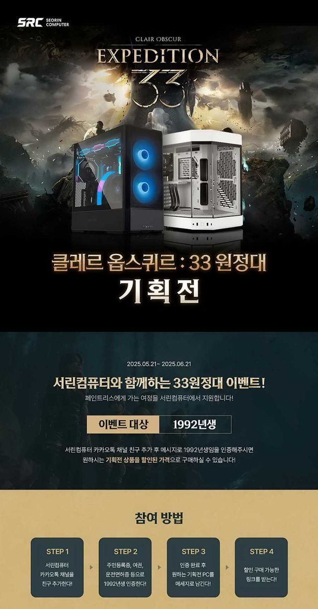 AMD와 인텔 프로세서를 각각 탑재한 고성능 완제품 PC가 서린컴퓨터를 통해 특가로 판매된다. 자사 운영 브랜드몰 서린컴퓨터를 통해 진행되는 이번 행사는 클레르 옵스퀴르 33 원정대라는 이름으로 기획됐으며, 1992년생을 대상으로 추가 할인 혜택이 제공된다.