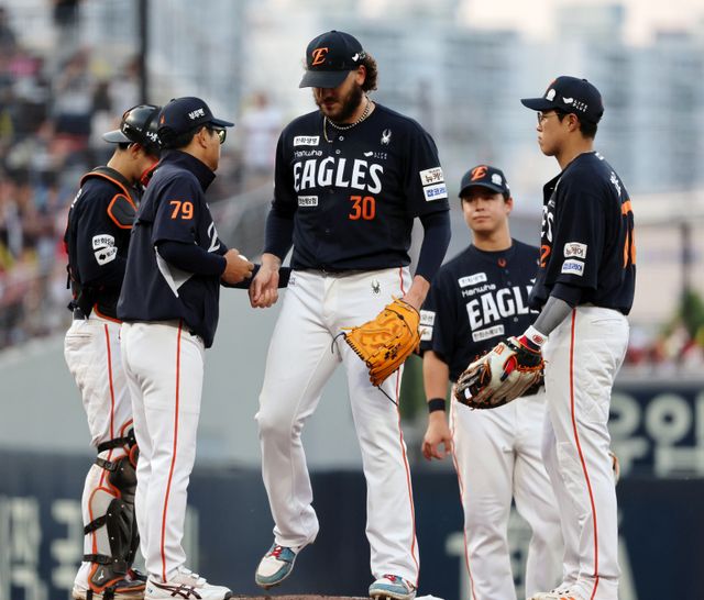 8일 광주기아챔피언스필드에서 열린 프로야구 한화 이글스와 KIA 타이거즈의 경기. 한화 선발투수 폰세가 6회말 무사에서 사구와 볼넷을 연속으로 내주고 교체되고 있다. 사진=연합뉴스
