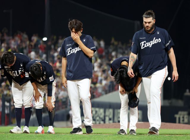 8일 광주기아챔피언스필드에서 열린 프로야구 한화 이글스와 KIA 타이거즈의 경기. 연장 10회말에 수비 실책으로 6-7 아쉬운 패배를 한 한화 폰세 등 선수들이 관중에게 인사하고 있다. 사진=한화 이글스 제공